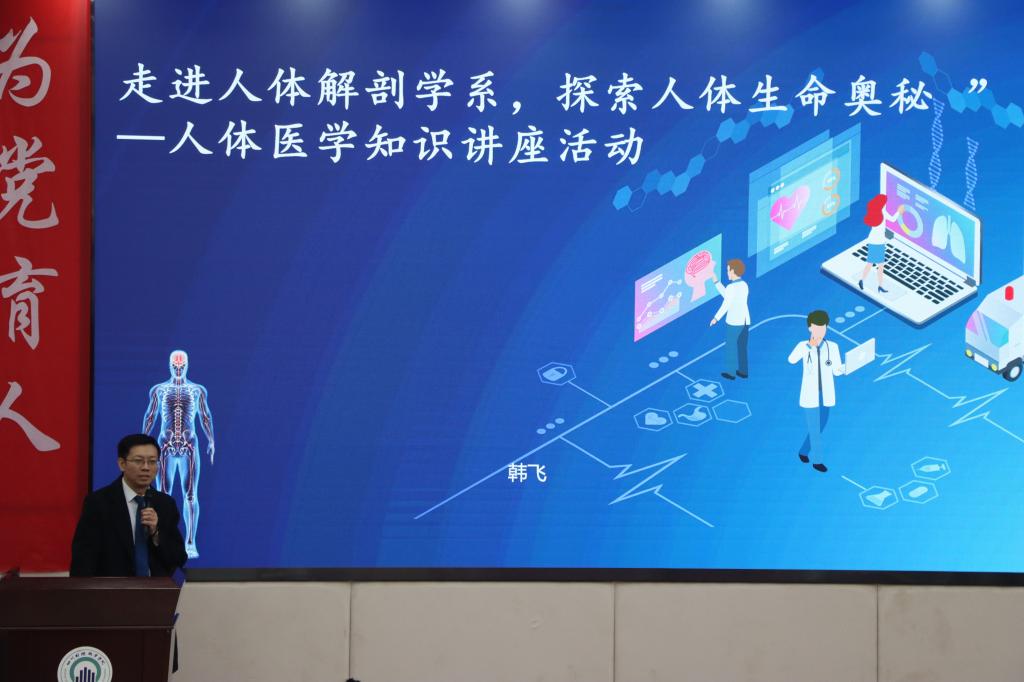 首先,韩飞医师从如何更好的运用和了解自己的身体的各个器官,提出中国在五千多年前就通过对婴儿进行智力和身体的发育进行训练,说明了解刨学在中国有着悠久的历史。不仅如此,韩飞医师还提出一个真理,每个人身体里都存在DNA,教育同学们每个个体都是独一无二的,自己的身体是宝贵的,要珍惜自己的身体。