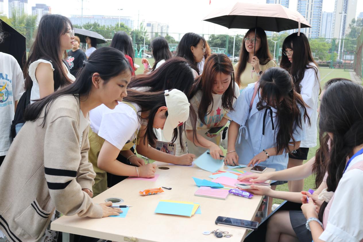 折纸飞机的动作熟悉又陌生,仿佛打开了通往童年记忆的时光之门。轻轻地将纸张对折再对折,似乎唤起了大家儿时的回忆。在折好的纸飞机上写下近期的心愿或烦恼,普普通通的纸飞机,寄托着同学们的目标与梦想,瞬间变得意义非凡。