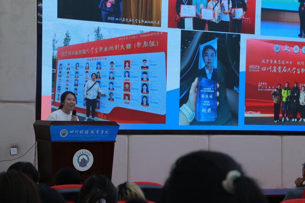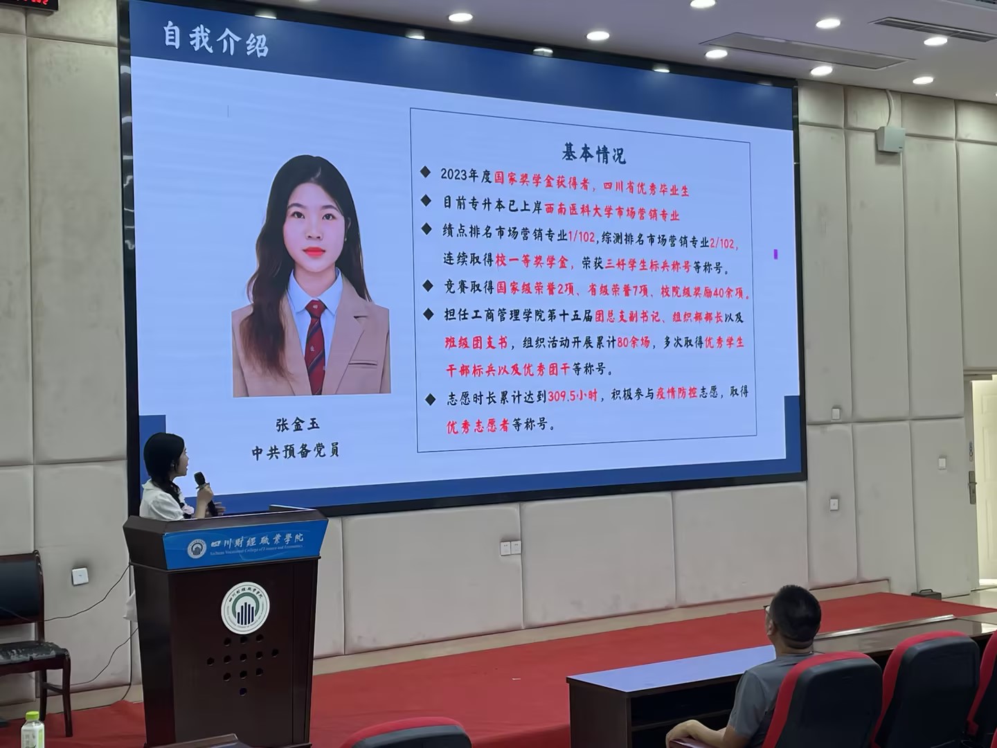 随后,21级营销1班张金玉进行分享,她从学习篇、工作篇、竞赛篇以及实践篇四个方面进行分享。高考的失败让她不甘,于是她早功打卡,早到晚退,最终专升本上岸。对于她来说,从学校到社会,就是从打牢基础到奋发勇进。同时她指出“纸上得来终觉浅,绝知此事要躬行”,学以致用才是学习的根本目的。漫漫求学路中,不断锻炼自己、提升自己才能展示真正的个人能力。21级移商2班杨怡培结合自身经历,从校内校外经验为同学们开拓思路。在大一初期,要尽快摆脱迷茫,融入大学生活。拒绝无效内卷,找准自己的目标;拒绝随波逐流,勇于探索全新道路。关于创业她又提出:从自身出发,根据自身能力兴趣确定方向。在实践中摸索,在实践中成长。
