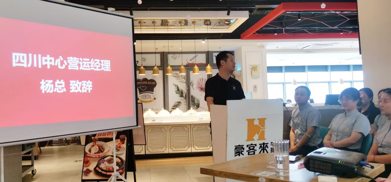 杨总代表豪客来向学校领导和老师们致以最诚挚的敬意和感谢,感谢学校的信任与支持,并强调在这次校企合作中,学校在人才培养方面的卓越理念和务实举措,坚定了校企之间携手共进的信心。经过30余年沉淀,豪客来形成了自己独有的企业文化和专业的人才培育体系。豪客来具备专业系统的课程和丰富的实践机会,重视职业发展规划和各项领导才能的培养,将充分发挥豪客来企业的优势,实现从学生到管理型人才的完美蜕变。杨总鼓励同学们在接下来的百天培训计划中,不断挑战自我,成为豪客来的优秀管理人!