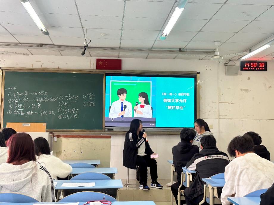在"离谱梦想"的碰撞中激发创造力,在“摆烂毕业”的辩论里校准价值观,在“人生暂停键”的设想间明晰使命感,这种沉浸式教学模式不仅让学生获得沟通技巧的跃升,更在价值认知、职业规划和使命担当层面实现多维突破。这场教学革新尤为注重差异化人才培养,为“3+2”学制的学生群体量身打造个性化的教学改革方案。通过前期调研学生兴趣与学情,教师团队精心定制了“校园与社会辩论赛"主题采访实验室"等学习项目,将课程模块与社会认知深度对接。团队创新采用游戏化任务闯关、场景化角色扮演、竞赛化成果展示的教学法,使课堂成为融合知识传授、技能提升与价值引领的成长孵化器,为应用型人才培养提供了鲜活样本。