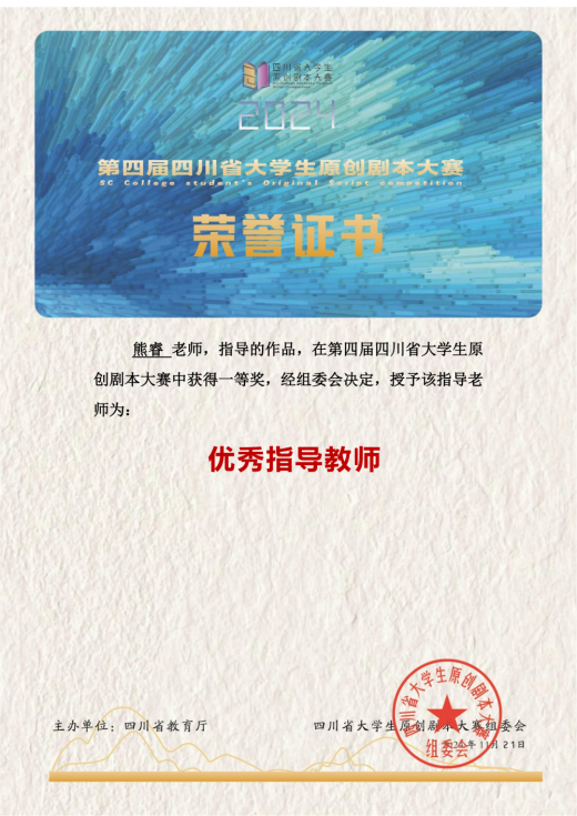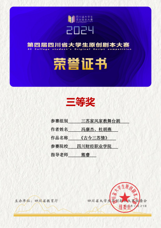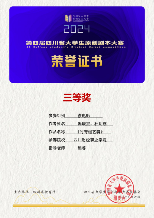 本次大赛由四川省教育厅主办,四川师范大学承办,四川省高校正式注册的在校学生(专科生、本科生、研究生)均可参加,共有四个赛道。以巴蜀沃土为根基,特别融入青神文化精髓——让千年竹编的经纬交织着青衣江畔的文脉,使青神椪柑的甜蜜果香传递着川蜀人民的生活智慧。经过激烈角逐,7790cnm必发集团工商管理学院队伍在熊睿老师的带领下分别在三个赛道赛道1:微电影、舞台剧、曲艺剧本创作 。赛道2:“东坡神韵”网络短视频剧本创作 。赛道3:“三苏家风家教”剧本创作。获得奖项,其中一等奖一个,二等奖两个,三等奖两个,并获得优秀指导教师。