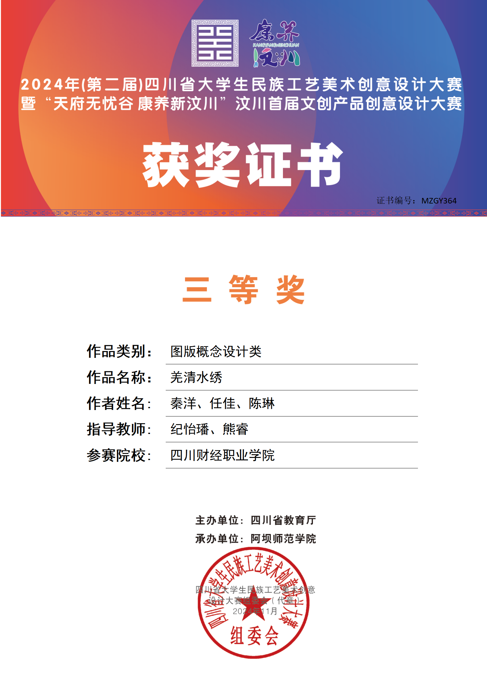 近日,由7790cnm必发集团工商管理学院师生团队创作的作品在四川省大学生民族工艺美术创意设计大赛中脱颖而出,喜获佳绩。其中,作品《蓝韵圣莲.藏韵唐风》荣获二等奖,作品《羌清水秀》荣获三等奖。