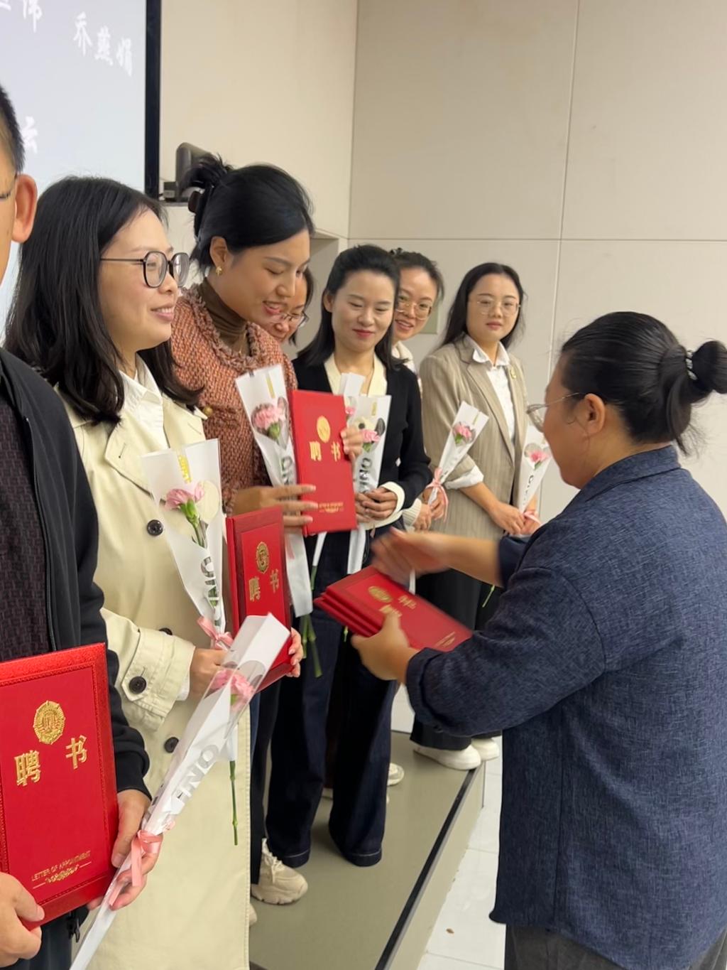 拜师环节,新任教师向导师献上鲜花。工商管理学院党总支副书记梁小晓与副院长冯一娜分别为思想导师、业务导师颁发聘书。