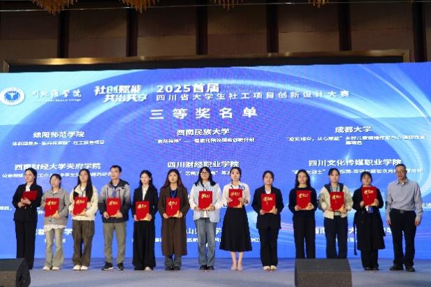2025年11月9-10日,在项目负责老师王欣然的带领下,由工商管理学院谢予希、孙菁雨、熊琳、伍春霞四位同学组成的“魁”艺新生·“电”亮乡村团队,奔赴南充参加2025年“首届四川省大学生社工项目创新设计大赛”。经过激烈角逐,团队凭借其围绕彭州军屯锅魁设计的创新型社工项目,在比赛中表现优异,最终荣获大赛三等奖。