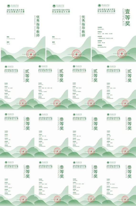本次大赛以“创新引领振兴,创意点亮乡村”为口号,设立“守望农耕根脉,共绘乡村新景”农业文化遗产保护与传承和“川农华诞·躬耕致远”川农120周年校庆两大平行主题赛道,涵盖产品设计、品牌形象设计、营销传播推广等多元领域,吸引全省多所高校学子同台竞技,以创意赋能乡村产业升级与文化活化。经过激烈角逐,我院学子在比赛中表现突出:由纪怡璠、刘国强、吕世伟、陈兰、林红梅、孙家阳、王好燕七位专业老师指导的参赛团队,共斩获一等奖 1 项、二等奖 4 项、三等奖 8 项,其中刘国强、林红梅两位教师因指导成效显著,获评 “优秀指导老师” 称号。