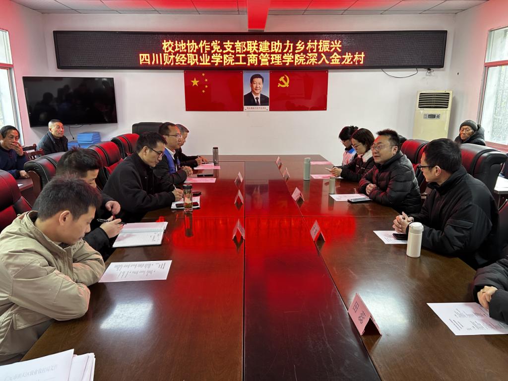 首先,工商管理学院师生团队与金龙村驻村工作队、村干部举行了专题座谈。会上,双方围绕金龙村发展现状、产业布局、现实挑战与未来规划展开深入交流。工商管理学院党总支书记梁小晓介绍了学院在学科建设、人才培养及社会服务方面的特色与优势,强调学院始终坚持将教育实践与地方发展需求相结合,并特别提出希望挖掘当地的红色资源,将其融入我院红色财经文化与川商文化之中,以生动展现红色基因在乡村振兴中的传承与实践。同时期望通过此次实地对接,精准把握乡村实际,探索校地协同新模式,为金龙村振兴注入高校智慧与力量。驻村工作队及村干部对学院师生们的到来表示热烈,并期待在党建共建、产业规划、人才培训、乡村振兴等方面深化合作。此次交流为后续系列活动的开展以及未来的深度合作奠定了坚实基础。
