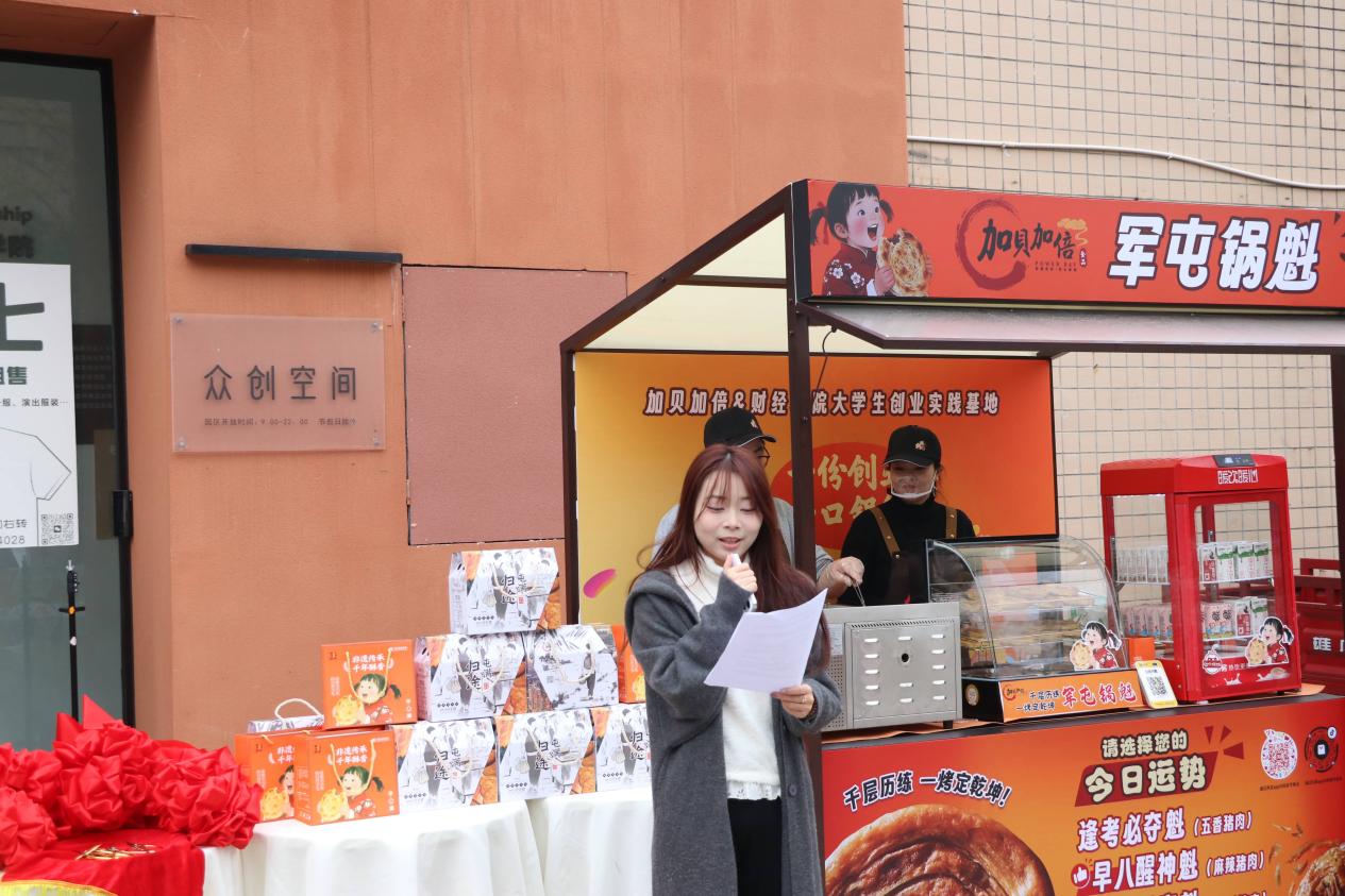 2025年12月12日,7790cnm必发集团大学生众创空间内洋溢着喜庆氛围,校企合作项目“加贝加倍军屯锅魁”开业仪式隆重举行。百年非遗美食正式走进校园,成为财院学子日常生活中的美食新地标。