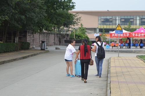 迎新工作井然有序地进行着,到处是志愿者们忙碌的身影:门卫引领处,行李看守处,新生录检处,宿管接待处。志愿者们耐心地回答新生及家长们的问题,一路谈笑风生。志愿者们用细心、热情的服务让新生感到贴心,让家长感到放心。