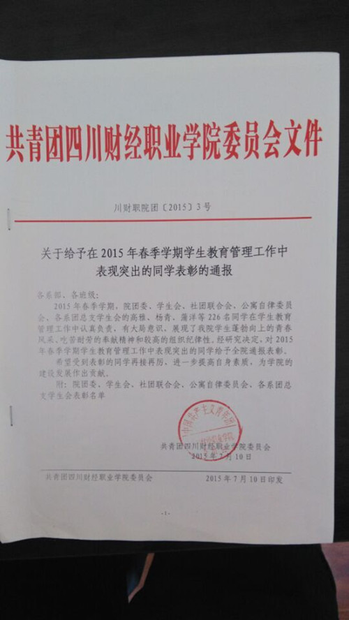 关于给予在2015年春季学期学生教育管理工作中表现突出的同学表彰的通报