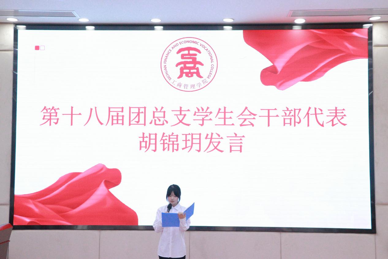 第十八届干部代表胡锦玥同学发言,首先向给予支持的领导、老师和同学们致谢。回顾过去学生会开展众多活动,自己从中收获成长。承诺新一届干部将传承优良传统,以创新务实、公正负责的态度开展工作,搭建沟通桥梁,凝聚团队力量,服务同学,推动发展,不负期待。