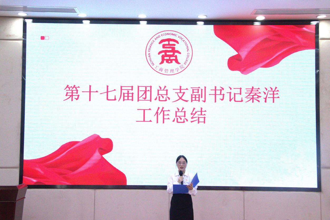 第十七届团副秦洋同学作工作总结,2024年9月以来,学院团总支在思想建设上规范党团工作、开展红色教育;文化活动中多部门联动,举办各类活动并通过新媒体部门广泛传播;志愿服务常态化开展且成果显著。同时她指出工作中存在的不足,希望新一届的团总支能够更好更优地推进各项工作。