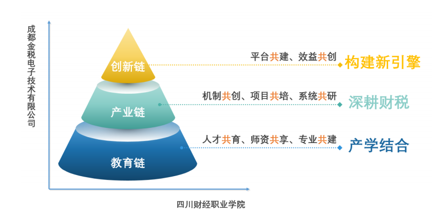 我院与成都金税电子技术有限公司校企携手合作深耕财税行业历经十载。2012年搭建校企合作平台,携手人才共育、师资共享、专业共建构建教育链。2017年校企联合成立“四川财经-成都金税产学研研究院”,在机制共创、项目共培、系统共研深化合作打造产业链。2020年12月成立“四川财院金税产学研科技咨询有限责任公司”,搭建命运共同体,通过平台共建、效益共创打造创新链,是学院贯彻《国家职业教育改革实施方案》、落实《职业教育提质培优行动计划(2020-2023年)》的典型范例。