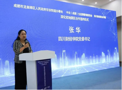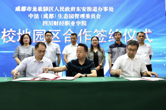 学院副院长(主持行政工作)符刚,东安街道党工委副书记、办事处主任吴震,龙泉驿区外商投促中心副主任(中法生态园管委会班子成员)杜成立出席仪式并签署校地园区合作协议书。区委组织部、区委社治委、区教育局相关领导受邀出席仪式,见证合作签约。学院党委委员、副院长罗潇及部分中层干部,东安街道党政领导班子成员,中法(成都)生态园管理委员会领导班子成员参加仪式。