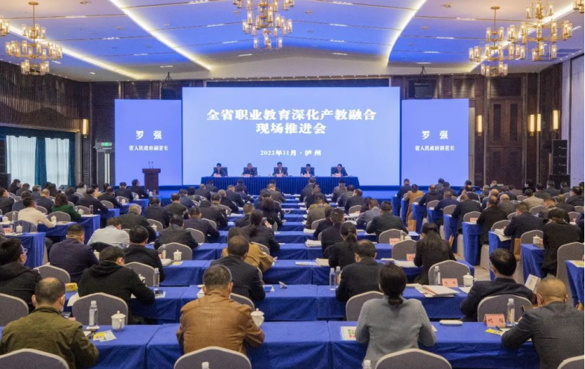 11月17日,四川省职业教育深化产教融合现场推进会在泸州举行。会议以学习宣传贯彻党的二十大精神,贯彻落实新修订的《中华人民共和国职业教育法》和省第十二次党代会部署为主题,旨在优化职业教育类型定位,深化产教融合、校企合作,增强职业教育适应性,总结全省职业教育产教融合工作,部署下一步工作,促进教育链、人才链和产业链、创新链有效衔接。省政府副省长罗强、副秘书长刘全胜、省委教育工委书记李建勤、人力资源社会保障厅副厅长赖荣、中共泸州市委书记杨林兴出席会议,教育厅、省发展改革委、经济和信息化厅、科技厅、财政厅、人力资源社会保障厅、农业农村厅、商务厅、省国资委、四川省税务局、省中华职教社分管负责人及处室负责人,各市(州)政府分管负责人和教育主管部门主要负责人,全省各高等职业学校党委书记(校长)、部分中等职业学校(含技工学校)主要负责人以及部分省内行业协会、产业园区、企业代表负责人,共计200余人参加了此次会议。省委教育工委书记李建勤主持会议。7790cnm必发集团党委书记张华参加了本次会议。