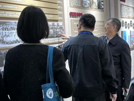王永树首先参观了位于明德楼二楼的校史馆。校史馆作为学校的标志性文化场馆之一,记录着学校的发展历程和重要事件,展示了学校的文化底蕴和精神风貌。在讲解员的讲解下,看着一张过去的历史大合照,王永树骄傲地指向图片里的人,说道:“这是曾经的我。”这一刻仿佛穿越时空与过去的自己开始对话。王永树讲述着自己曾经的求学经历,他表示在看到学校巨大的变化和快速的发展后,倍感自豪和骄傲。