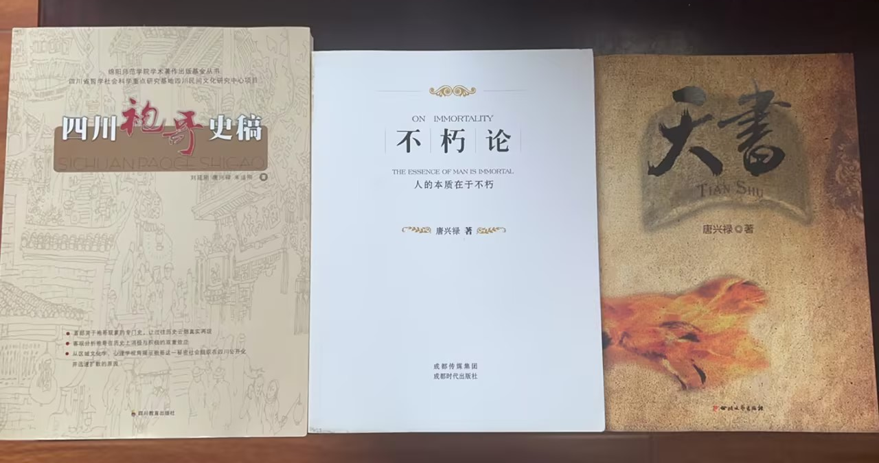 《四川袍哥史稿》并不只是停留在对史料的钩沉上,而是从社会学、民俗学、宗教学、心理学的多种角度,从逻辑发展上探索袍哥存在和消亡的历史必然性,把逻辑发展与历史过程结合起来构筑框架,具有逻辑上的科学性。由于袍哥在四川有着非常深厚的土壤和根基,袍哥文化对川人在语言、心理甚至行为方式方面的影响,特别是潜移默化的影响,对川人文化性格的“集体无意识”构成的影响,还很值得探究和挖掘,这不是简单地从肉体上消灭和组织上剪除能够解决问题的。 《不朽论:人的本质在于不朽》该书是作者历时五年、八易其稿的研究成果。该书从人性出发,对人的自然属性、社会属性和超越属性进行了分析研究,提出了“人的本质在于不朽”的哲学命题。 《天书》这是一本原创小说。讲述了西都市在考古发掘中发现了传说中的狼人历史遗存,正准备作为文化旅游项目隆重推出,遗址区的文物却遭到人为破坏,狼人的后裔也被杀害和绑架。随着狼人历史真相的逐步揭示,江湖与庙堂、名位与金钱的纷争与角逐也随之浮出水面。
