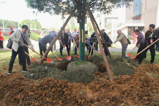 参观校园结束后,校友们汇聚在明德楼旁的绿化带内,老校友们向学院捐赠了两棵朱砂金桂。栽种时校友们异常兴奋,在当年学生会主席罗盛昌的带领下,大家纷纷拿起铲子,与张华书记等院领导一起,围着树木为树木培土,为树木浇水。象征“根系财院”的朱砂金桂在大家的见证下,傲然挺立,迎风招展。