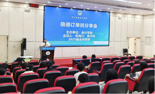 为进一步推动学生实习实践,深化产教融合,发挥校友在学院人才培养中的作用,2024年5月17日13:00,会计学院信德订单班分享会在致诚楼B212成功举办,校友工作专员郭海川老师、专职辅导员黄于桁老师出席本次活动,2025届大二学生积极参加。