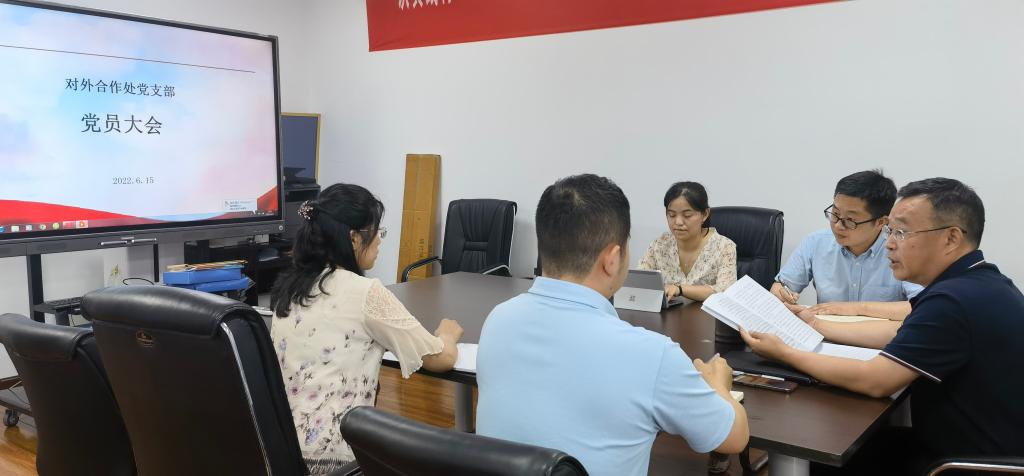 2022年6月15日,对外合作处党支部在明德楼802室召开支部党员大会,会议由支部书记叶剑明主持。