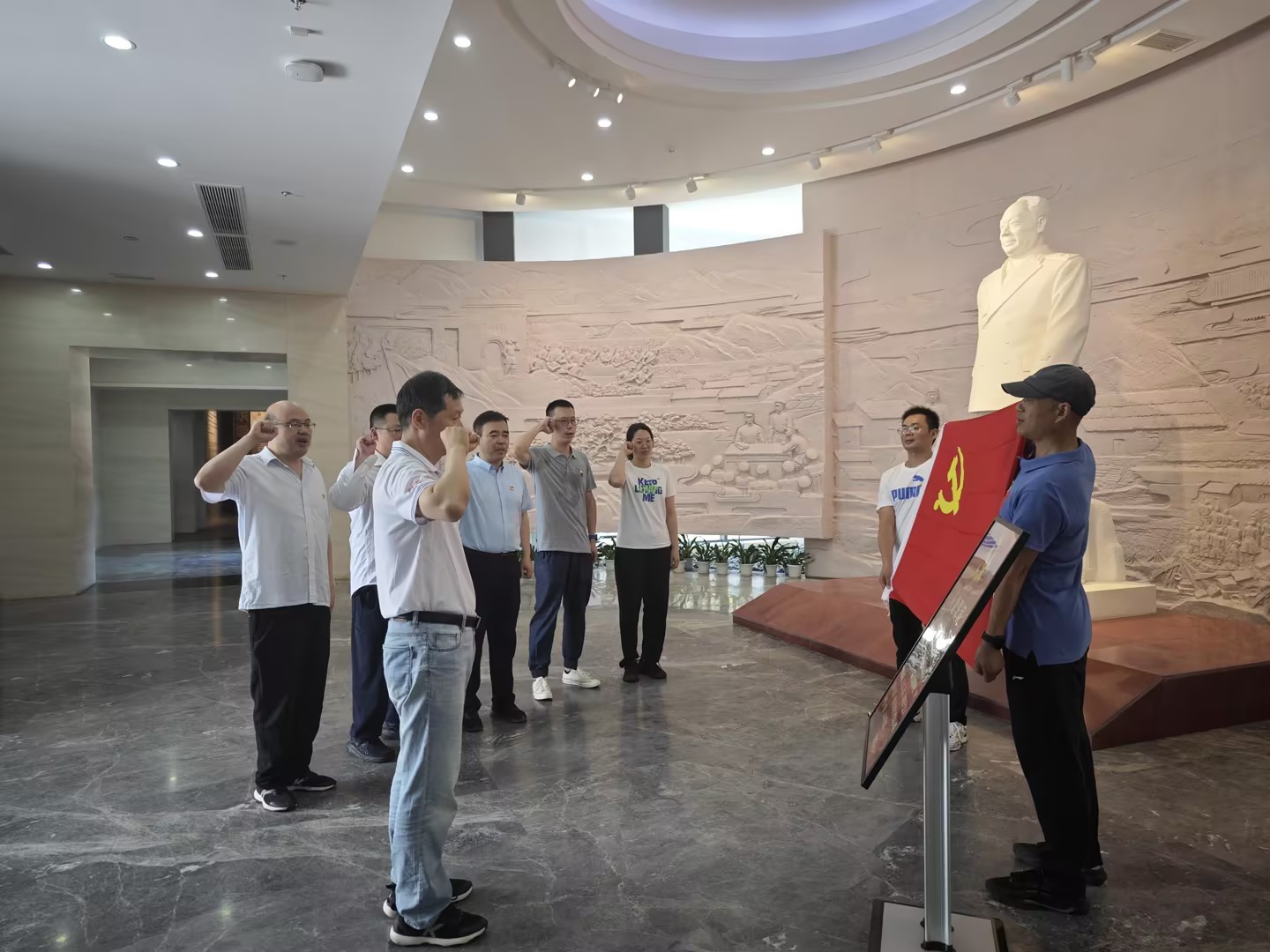 在陈毅元帅的雕像前,全体党员面向党旗,高举右手,重温入党誓词。党旗鲜红、誓言铮铮,党员同志们以铿锵有力的誓言激励自己牢记入党的初心和使命,永葆共产党员的政治本色。