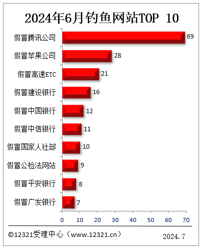 7月8日消息,根据 12321 网络不良与垃圾信息举报受理中心接到网民投诉的短信、邮件、网站等信息,2024 年 6 月被投诉最多的是假冒腾讯公司的钓鱼诈骗网站,投诉量达 69 件次,比 5 月份减少了 11.5%。投诉排名第二的是假冒苹果公司的钓鱼诈骗网站,比 5 月份减少了 30.0%。