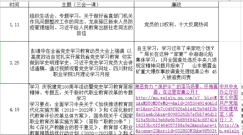四月份学习的廉政内容“有黑恶势力“保护伞”的落马场景、忏悔画面,在这里密集公开!”、中共中央办公厅印发《中国共产党组织处理规定(试行)》文件学习。通过自学和集中学习的方式,党务学习内容有全面学习中央关于《加快推进教育现代化实施方案(2018—2022年)》和《深化新时代教育评价改革总体方案》,国务院关于《国家职业教育改革实施方案》(简称“职教20条”)和《深化产教融合的若干意见》,教育部《职业教育提质培优行动计划(2020—2023年)》和《教育部2021年工作要点》,把好职业教育改革的新动向,落实中央、教育部、省委,省委教育工委、省教育厅有关重要会议精神、重要文件(决定),推进职教20条和提质培优行动计划重大改革项目的落地生根。