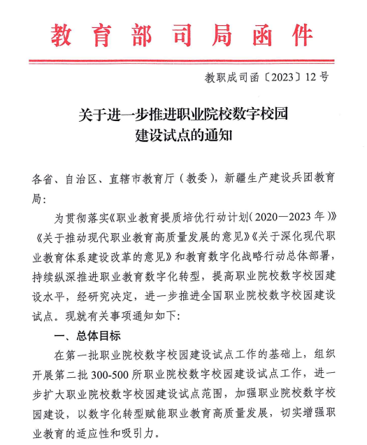2023年5月26日,教育部职业教育与成人教育司发布《关于进一步推进职业教育数字校园建设试点的通知》(教职成司函〔2023〕12号),我校成功入选教育部第一批职业院校数字校园建设试点单位。