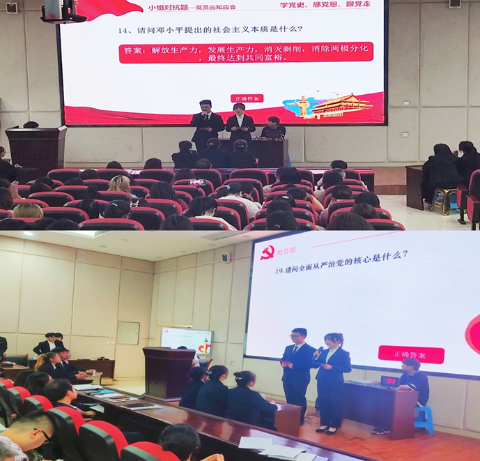 “学党史 感党恩 跟党走”系列主题活动共计分为四个板块,分别是:读四史、学四史、宣四史、践四史。首先,学生党支部组织解读《关于在全党开展党史学习教育的通知》精神,各党小组分别组织学习了《论中国共产党历史》《毛泽东、邓小平、江泽民、胡锦涛关于中国共产党历史论述摘编》《习近平新时代中国特色社会主义思想学习问答》和《中国共产党简史》等理论学习书籍,党总支书记和学生党支部书记讲党课等形式开展党史学习教育。 2021年6月3日15:40举办了“学党史 感党恩 跟党走”快问快答知识竞赛决赛,向全院各党支部展示了样板党支部党史学习教育成果。活动现场,大家欣赏了诗词的朗诵,领略了快板的魅力,感染了脸谱的欢乐,在必答题和对抗赛阶段,各小组展示了各自丰富的党史知识,接连回答高难度的题目让全场不由得发出雷鸣般的掌声。