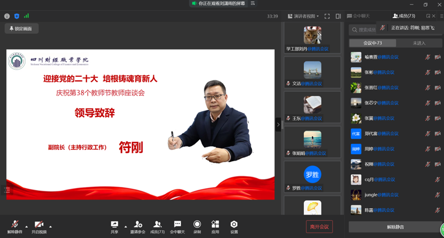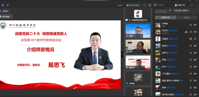 丹心育桃李,金秋颂良师。2022年9月9日下午,我校以“迎接党的二十大 培根铸魂育新人”为主题的庆祝第38个教师节座谈会通过线上方式举行。全部校领导参加会议,各二级学院院长、党总支书记,相关职能部门主要负责人,新入职教职工,老教职工代表共计70余人参加座谈。座谈会由组织人事部副部长饶明全主持。