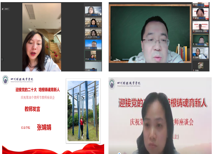 来自通识与人文教育学院的胡娴、金融学院的王超、信息学院的张娟娟、马克思主义学院的汪丽娟作为老教师代表分别发言,分享各自从事教育事业的经历和感悟,充分展示了我校教师凝心聚力守初心、干事创业谋发展的优良作风;来自教务处的谢文静、会计学院的任思琦、财税学院的罗婷婷、工商管理学院的刘国强作为新入职教师代表进行发言,表达了对未来财院工作的憧憬,展现了新教师昂扬向上的精神风貌。