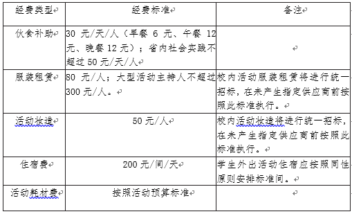 (一)活动期间学生伙食补助(明确由学院支付)、服装租赁、妆造、住宿、耗材费等,经费使用标准具体如下(表1):