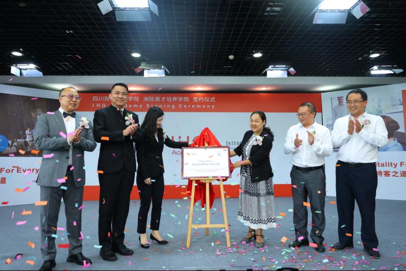 在双方代表的见证下,学院党委委员、副院长罗潇与洲际酒店集团大中华区首席财务及运营支持总监贾真共同签署了合作协议。学院党委书记张华,党委委员、副院长罗潇,党委委员、副院长肖兆飞与洲际酒店集团大中华区首席财务及运营支持总监贾真,四川区域总经理、成都环球中心天堂洲际大饭店总经理林志华,大中华区西区区域财务及业务支持总监姜山一起共同点亮灯球并为此次签约仪式揭牌。