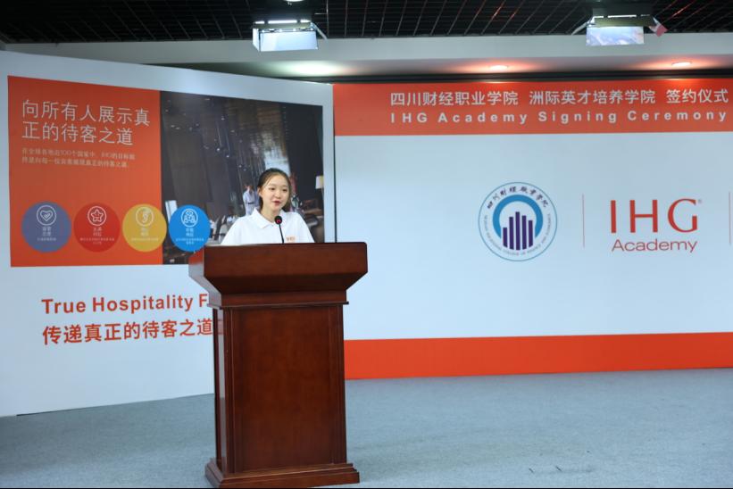 洲际英才培养学院现代学徒制班学生王芸芸代表2021级酒店管理与数字化运营专业55名新同学,表示将刻苦学习、勤于实践,努力提高专业技能知识,带着自己的梦想不断前进。2020级大数据与财务管理专业学生余婷婷代表2021、2020级100名订单班同学,表示非常珍惜此次进入订单班的机会,“感谢学院与洲际酒店能给我进入洲际订单班学习的机会,让我们能提前接触企业实践,我们将珍惜机会,认真学习,知行合一。”
