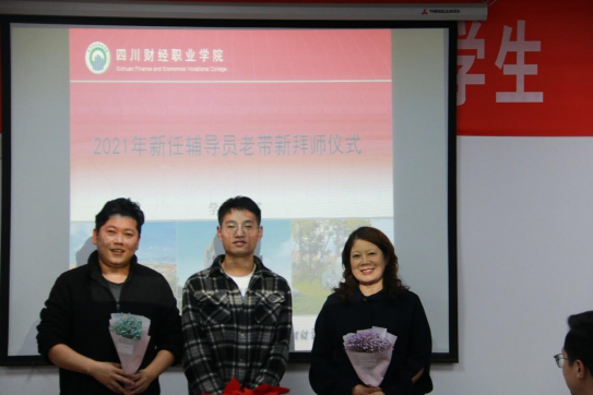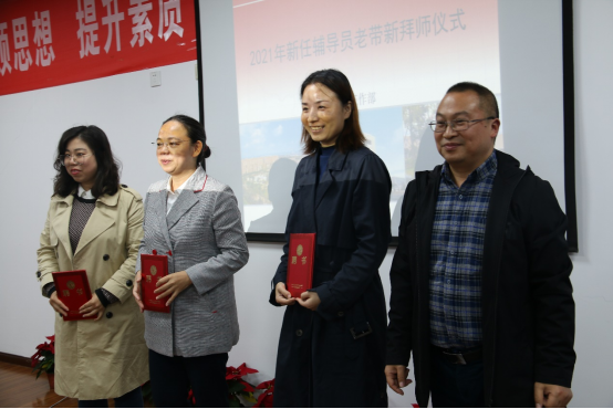 罗潇副院长为新任辅导员的思想导师和业务导师颁发了聘书并带领新任辅导员老师们宣读了高校辅导员誓词,新任辅导员分别向导师们献花、行拜师礼。