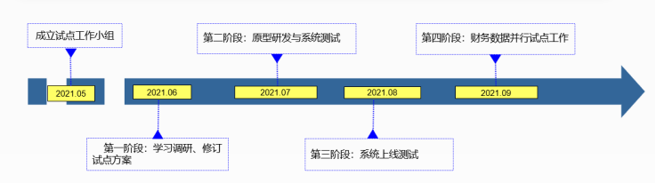 2021年5月-2021年10月,试点工作小组按试点工作方案展开了学习调研、系统研发、测试与上线、并行试点等阶段的高效工作。