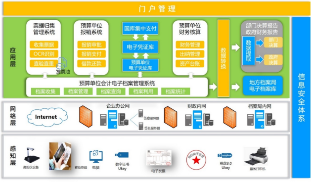 系统整体架构以物联网三层体系架构为基础。感知层重点部署高拍仪、数字证书Ukey、单位电子签章、电子发票、税盘3.0Ukey等配套设备;网络层重点建设企业办公网,配套建设签章、签名服务器及相关网络信息安全设备;应用层重点建设票据归集、单位报销、财务核算和会计电子档案系统。整体系统架构如下图所示: