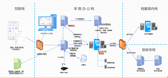 项目组根据学院现状研发了票据归集、报销、入账、归档一体化系统。构建本地票据池,实现在线票据归集查验管理,快速完成原始单据电子化处理,报销单据智能化填写,记账凭证自动生成,实现日常报销的网络审批、原始单据的电子化归档处理以及会计档案归档移交。