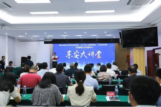 签约仪式后,校地园区联合打造的智慧教育品牌“东安大讲堂”盛大开讲,东安街道党工委副书记、办事处主任吴震作东安新城规划及重点项目介绍,中法生态园管委会常务副主任刘国松作《加快打造中法经贸合作中节能减排和绿色低碳发展典范》主题演讲。