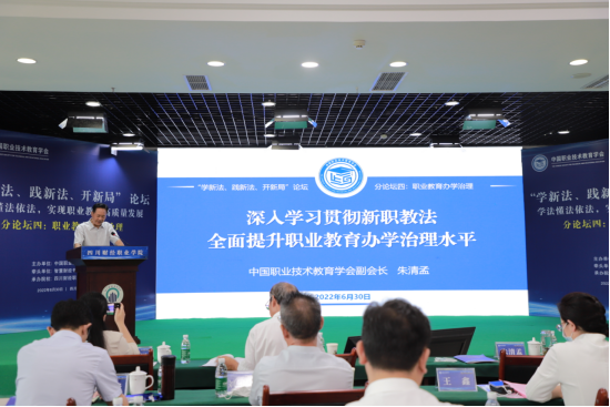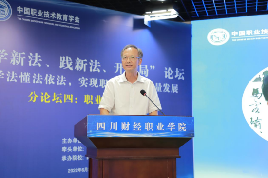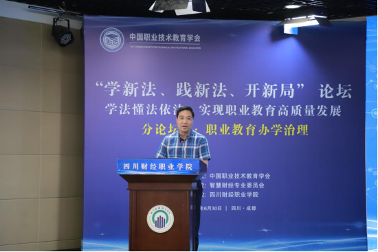 下午,六大分论坛围绕新修订的《职业教育法》各大板块设立。其中,“职业教育办学治理”分论坛线下活动由智慧财经专业委员会牵头、我院承办。省委教育工委委员,教育厅党组成员、副厅长张澜涛,中国职业技术教育学会副会长孙善学在线上致辞。中国科学院院士、西北工业大学柔性电子前沿科学中心首席科学家黄维作线上报告,中国职业技术教育学会副会长,河南省关工委副主任、河南省教育厅关工委主任朱清孟作现场分享,分论坛上半段活动由四川省职业教育与成人教育学会会长姜树林主持。