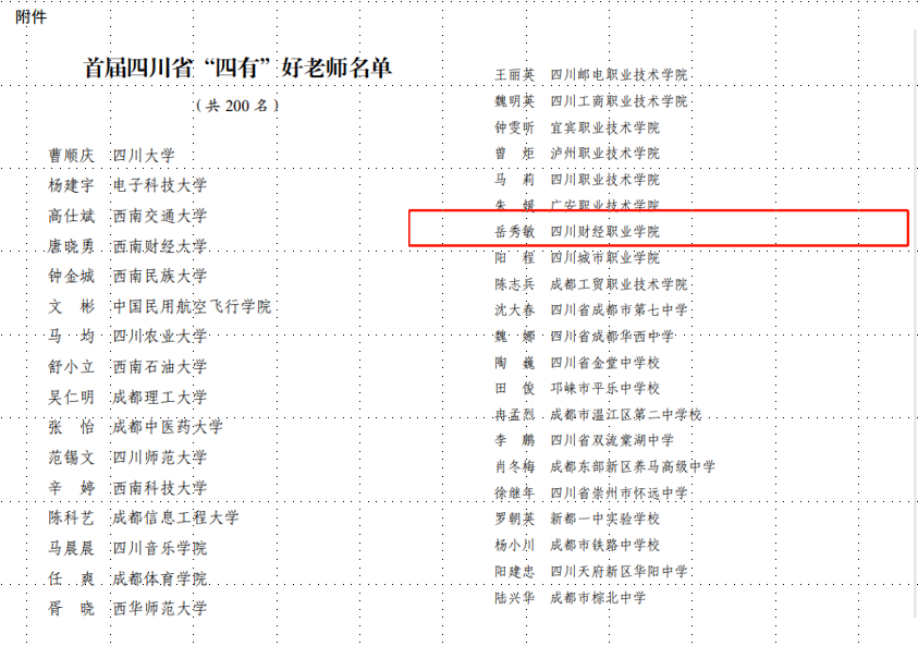 8月18日,中共四川省委教育工委 四川省教育厅公布首届四川省“四有”好老师名单,我院教师岳秀敏被评为首届四川省“四有”好老师。