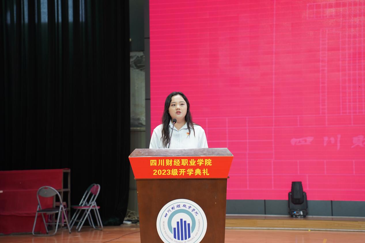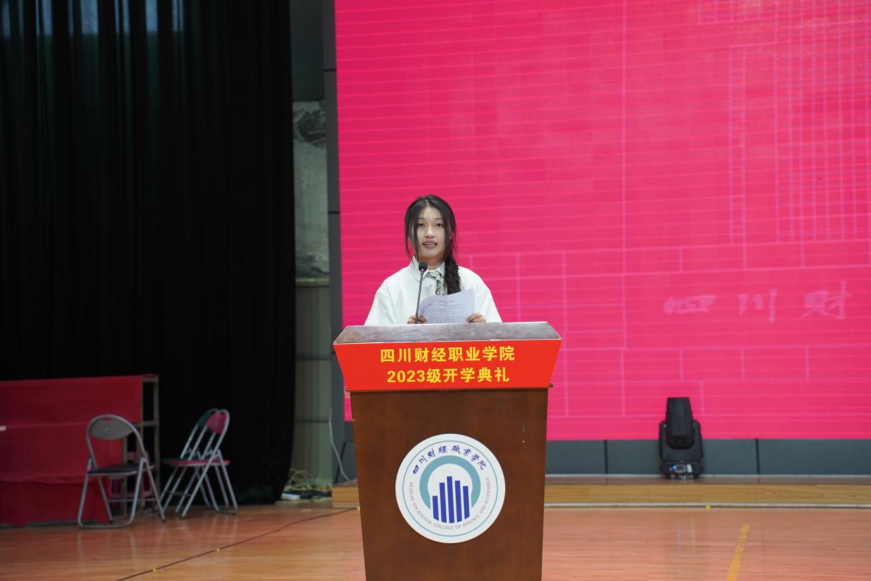 2023级电子商务1班马晶晶作为新生代表发言,她表示会尽快适应大学生活,尊敬师长、团结同学,与勤奋为伴,投身专业实践,争当新时代好青年。