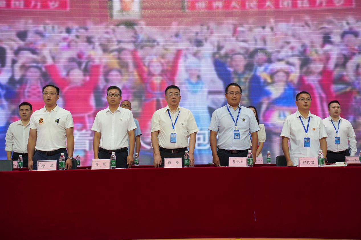 伴随着庄严的国歌声,全体人员肃立注视着五星红旗