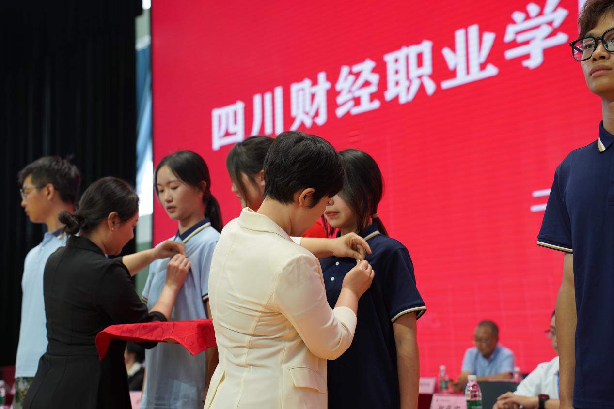 优秀教师代表为新生代表佩戴校徽