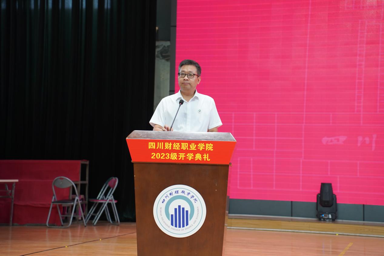 谆谆教导,殷殷期望。符刚在典礼上致辞,他代表学校向3097名2023级同学表示热烈欢迎,并向同学们介绍了川财悠久的历史发展、雄厚的师资力量、完善的教育教学条件。他以“爱”为主题,寄语同学们在川财的学习和生活中以“胸拥真情观沧海”的境界和“心怀大爱揽日月”的气魄,去感受爱、享受爱、践行爱,用爱去温暖这个世界、用爱去创造美好生活、用爱去描绘绚丽人生。他提出三点希望,一是希望同学们感受“爱”,感受党、国家、社会的磅礴大爱和亲人、师长、同学、朋友的温情真爱;二是希望同学们享受“爱”,希望同学们能去享受爱带来的一切美好与梦想;三是希望同学们践行“爱”,希望同学们能够以爱为指引,在“爱党爱国爱人民、爱校爱家爱生活”中践行爱,让爱之光芒温暖他人、闪亮自己。