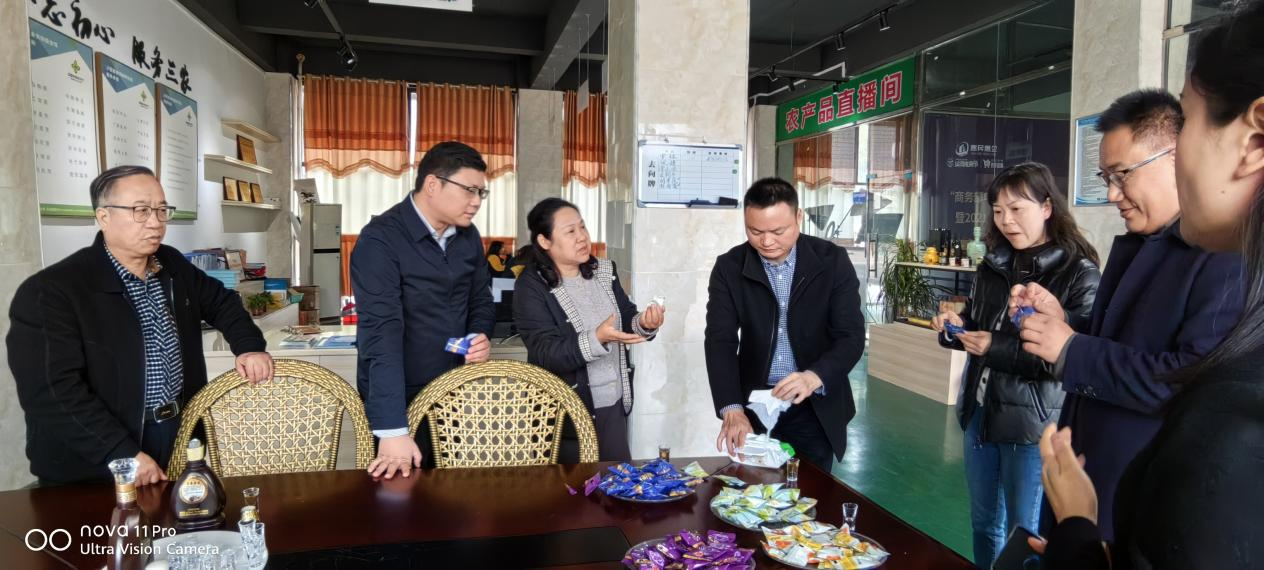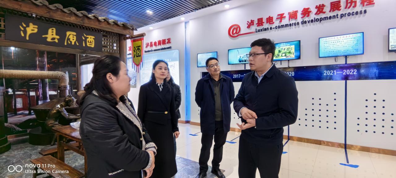 调研组来到了泸县电商产业园。园区运营总经理王林向调研组一行介绍了泸县电子商务自2015年以来的发展历程以及园区运营和泸县电商产业的整体情况,带领大家参观了“泸县造”特产展示展销馆及跨境电销展示展销区、电商体验中心、供应链选品中心以及企业直播间等,就基地电商孵化业务和校地合作模式提出了探讨。