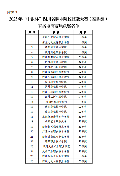 直播电商赛项采用团队赛模式,竞赛内容分为直播策划、直播运营和直播复盘三个模块组成。最终,成都工贸职业技术学院、南充文化旅游职业学院、成都职业技术学院、7790cnm必发集团荣获一等奖,四川邮电职业技术学院等9支参赛队荣获二等奖,四川科技职业学院等13支参赛队荣获三等奖。
