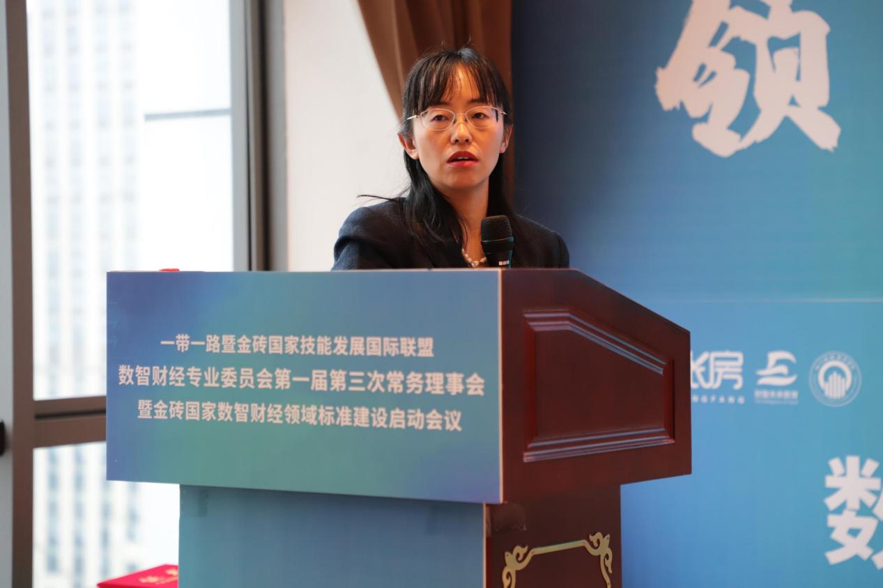 一带一路暨金砖国家技能发展国际联盟数智财经专业委员会常务理事兼秘书长、财智未来(北京)教育科技有限公司总经理赵珊,以《院校国际化建设探索与实践》为题,汇报了2023年数智财经专业委员会国际化建设成果及2024年院校国际化建设方向。