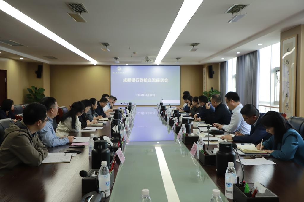 成都银行副行长陈海波、人力资源部总经理杨莉、长顺支行行长郑鹏、公司业务部副总经理肖瑜、个人金融部总经理助理张翼、长顺支行行长助理许檬、长顺支行个人银行部经理范艺山、长顺支行公司业务部经理朱家冀与学校对外合作处处长朱敏,财务处处长邱永芳,基建办公室主任林凯,金融学院党总支书记、院长叶剑明,继续教育学院院长刘瑶,会计学院副院长曾海帆参加座谈交流。