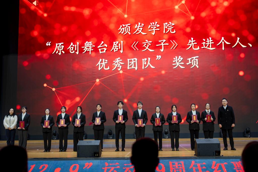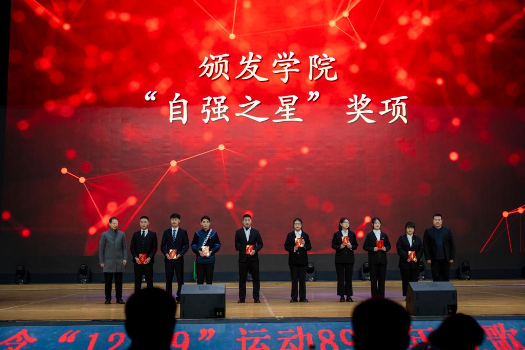 符刚宣读“12·9”表彰文件,对过去一年在工作学习、创新创业、社会实践等方面表现突出的学生进行了表彰。奖项涵盖了“国家奖学金”“国家励志奖学金”“先进个人”等十余项,表彰环节掌声不断。